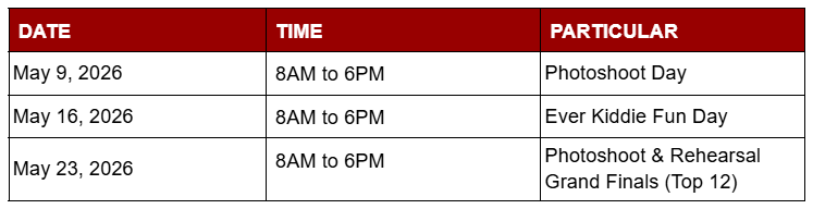 12. The GRAND FINALS of the Search for EVER KIDDIE STARS 2026 will be held on May 24, 2026 at the Mall Atrium of Ever Commonwealth from 4pm to 7pm. Twelve kids (6 boys & 6 girls) will compete in the Grand Finals.