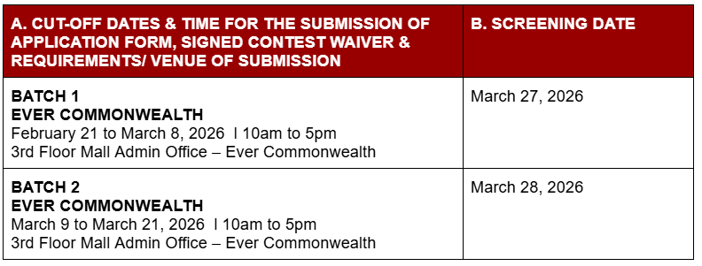 2. APPLICATION FORM, SIGNED CONTEST WAIVER and REQUIREMENTS must be submitted to the MALL ADMIN OFFICE. SCREENING TIME: 3PM to 6PM only